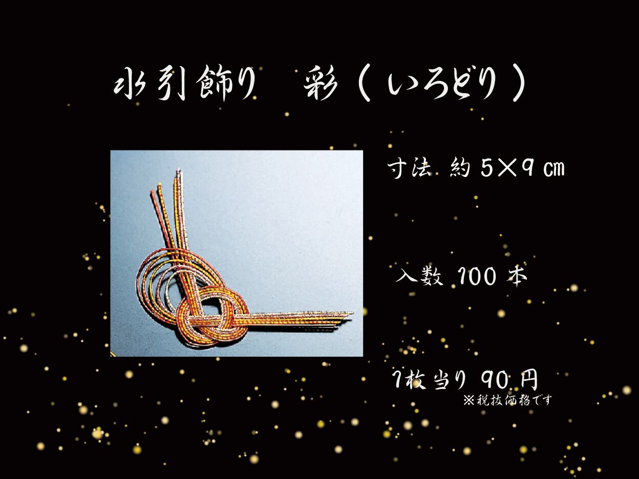 水引は、和の伝統的な装飾であり、縁起を担いできました。昔から縁起物として使われてきた水引飾りは、お祝いの席やお祭りの飾りとして重宝されています。お祝い事や記念日、特別なイベントにおすすめです。お客様の大切な場面を彩る「彩(いろどり)」をぜひご利用ください。
