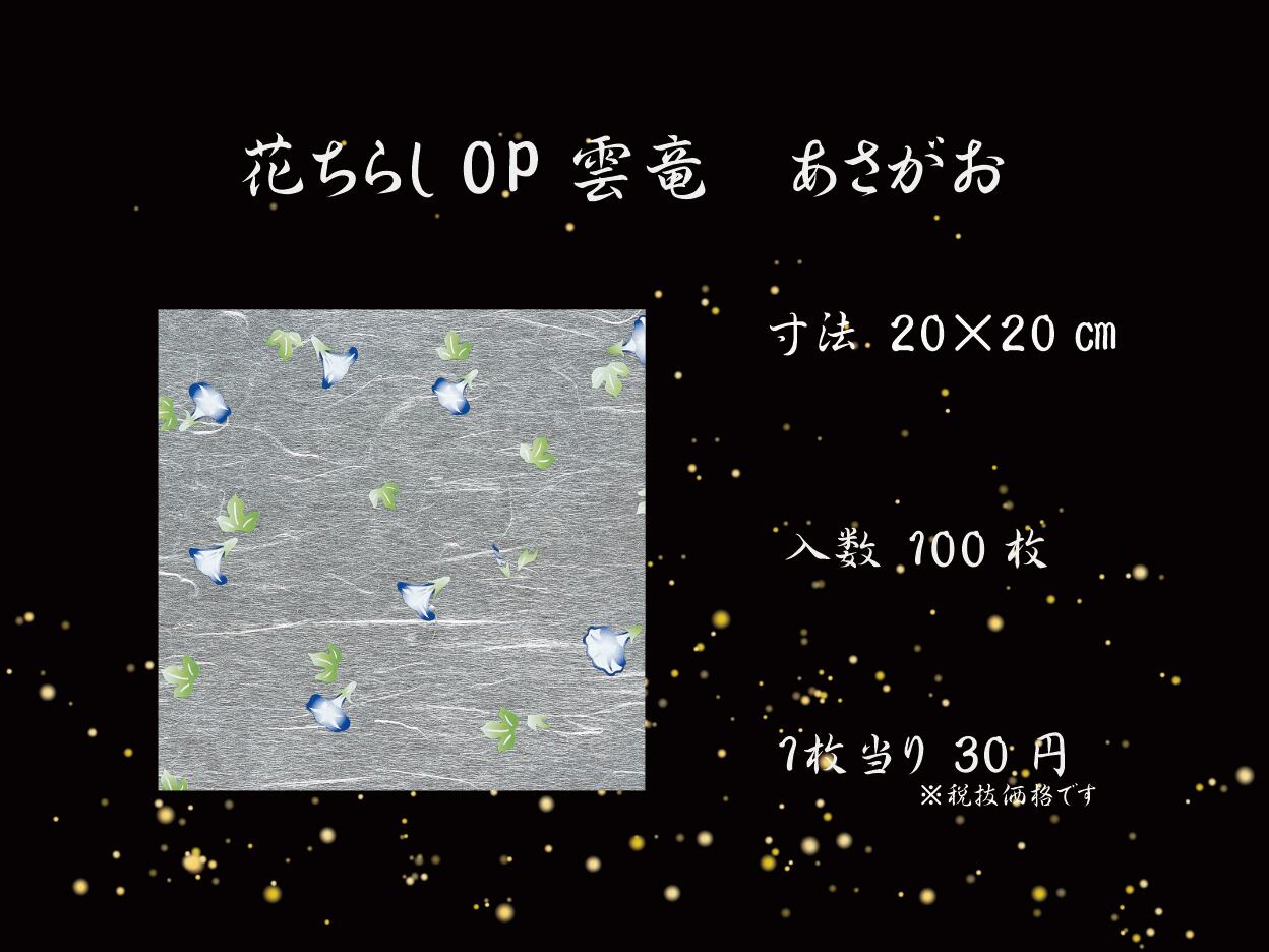 和紙を使用し、季節の花模様が美しく描かれた花ちらしOP雲竜。ラミネート加工が施されております。和の風情漂うデザインは、特別な食事やお茶会をより一層華やかにしてくれること間違いなし。
