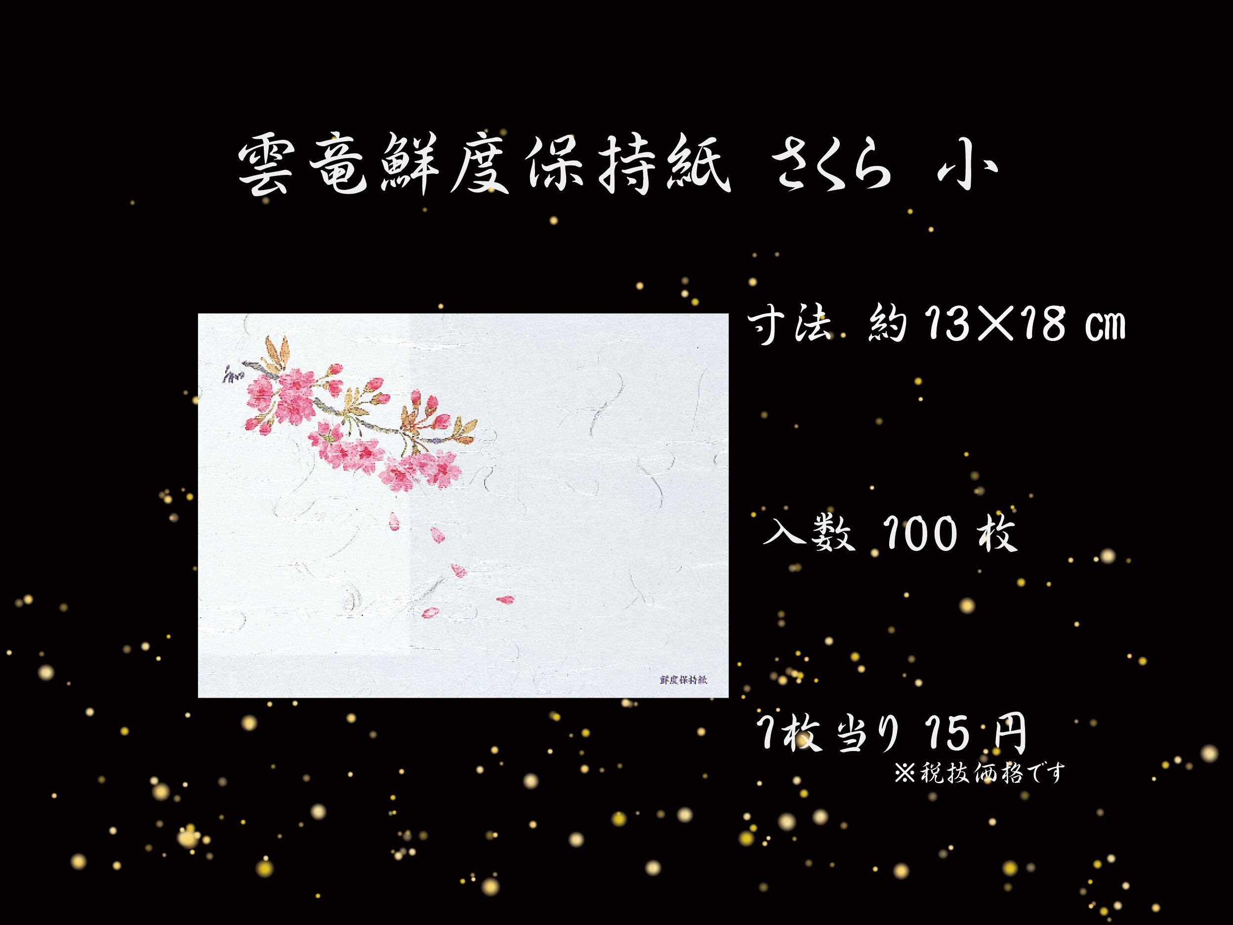 雲竜鮮度保持紙は、伝統ある和紙を使用した鮮度保持アイテムです。食材の新鮮さを長時間保つことができ、特に和食に欠かせないアイテムとなっております。季節ごとに異なる美しい柄が施されており、食卓を華やかに彩ります。